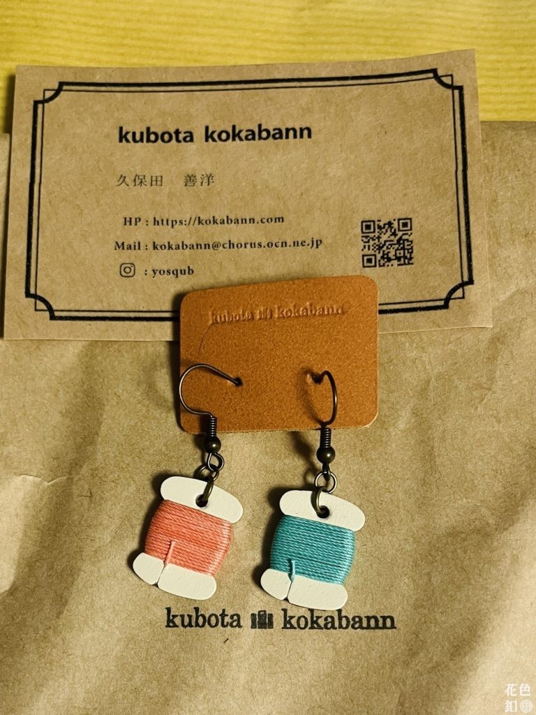 糸巻きモチーフのものが欲しいと思っていたのですが、こちらの糸巻きが一番可愛くてハートを射抜かれました。作者さんは糸を一生懸命巻いたそうです。表に出ているのはイヤリングでしたが、その場でピアスに変えて貰えました。