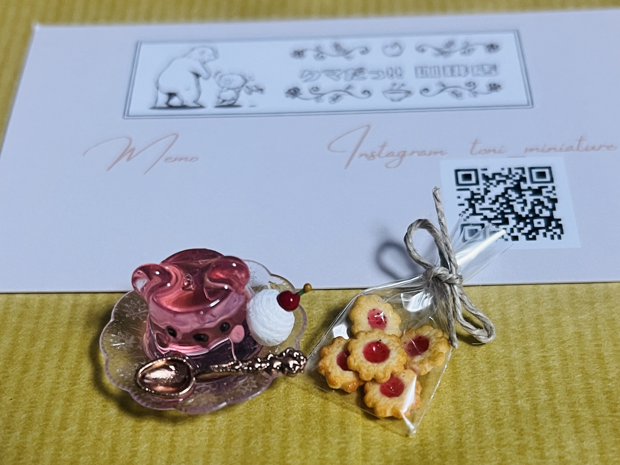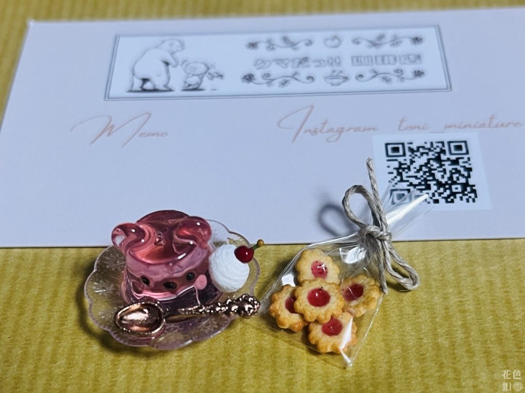 椅子や毛糸玉など、どれも可愛かったのですが、クマゼリーがとても綺麗だったのでこちらを。色違いがたくさんあって、迷いに迷ってピンク色(イチゴ)にしました。ジャム入りクッキーもすごく小さくて可愛いんです。
