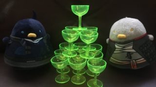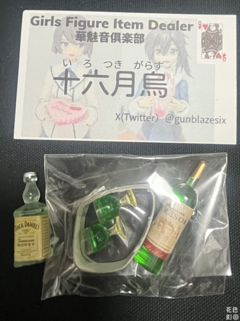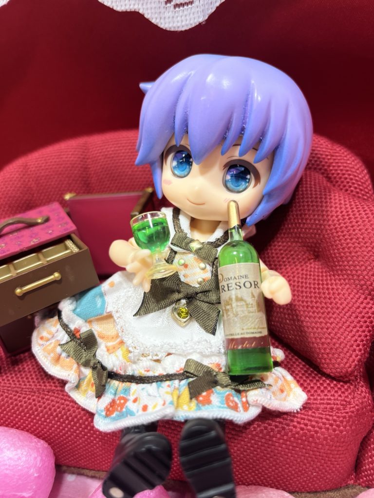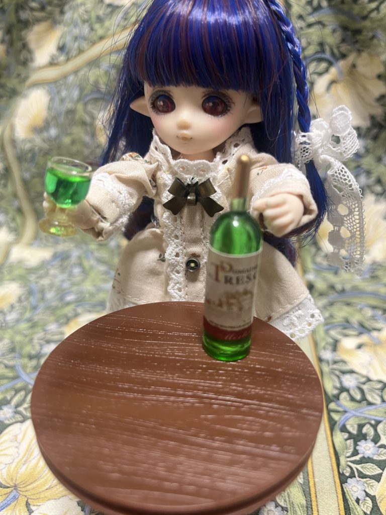 華魅音倶楽部、十六月烏(いろつきがらす)さんのお酒ミニチュア。これもたくさんあってかなり迷いました。が、ワインとペアグラスを探していたのでこちらの緑ワインを。実は、ペアグラスって意外となかなか売ってないのです! で、オビツ11に持たせたら、ワイングラスとワイン瓶の首の細いところが持ち手にジャストフィット! 素晴らしい! ねんどろいどどーるにも持たせたいですね。