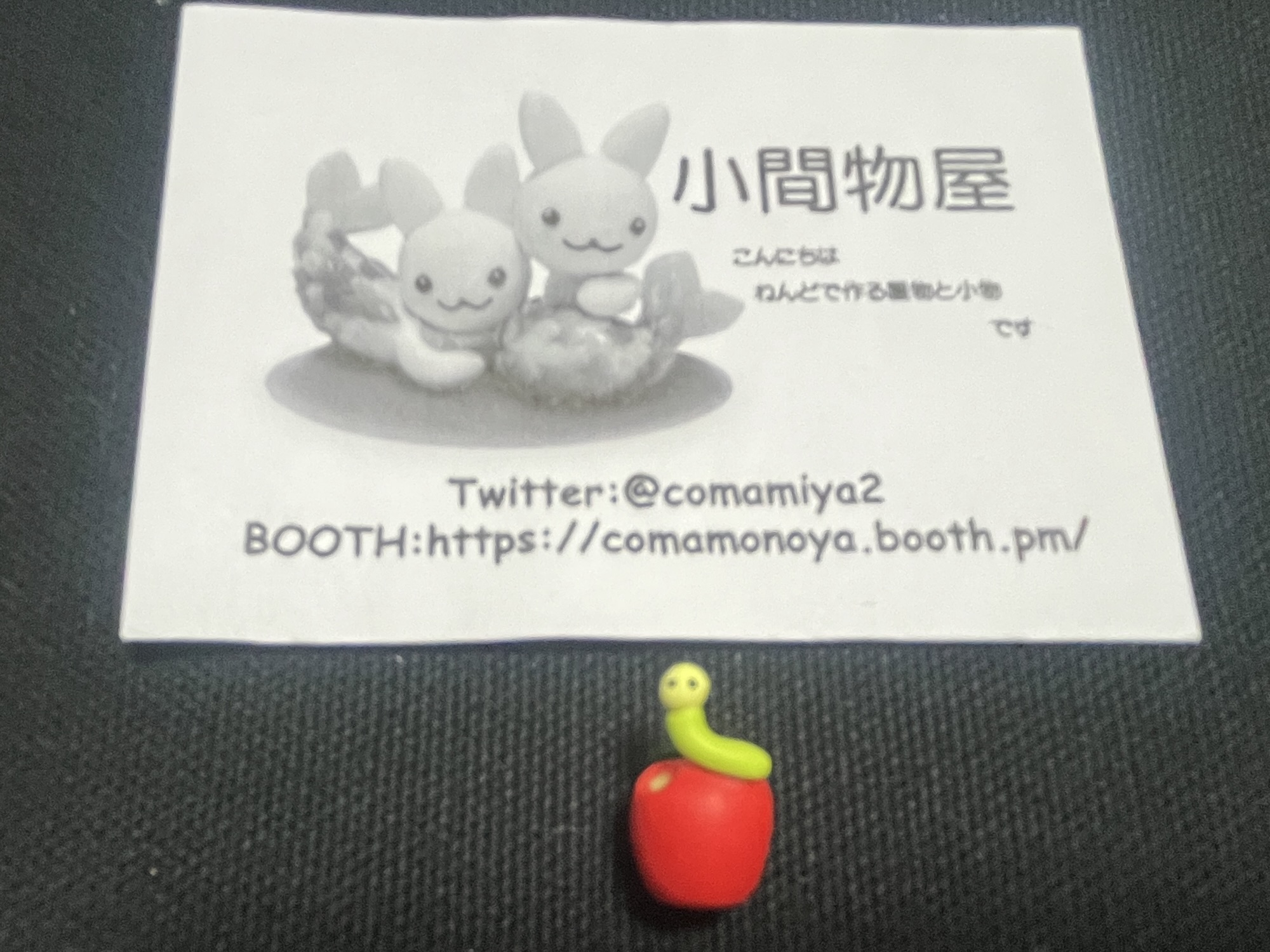 ミニチュアをたくさん売ってらっしゃったのですが、どれにしようかなと選んでいたら、この小さい命が目に入りました……。ちゃんと目までついてる! かわいくて即購入。